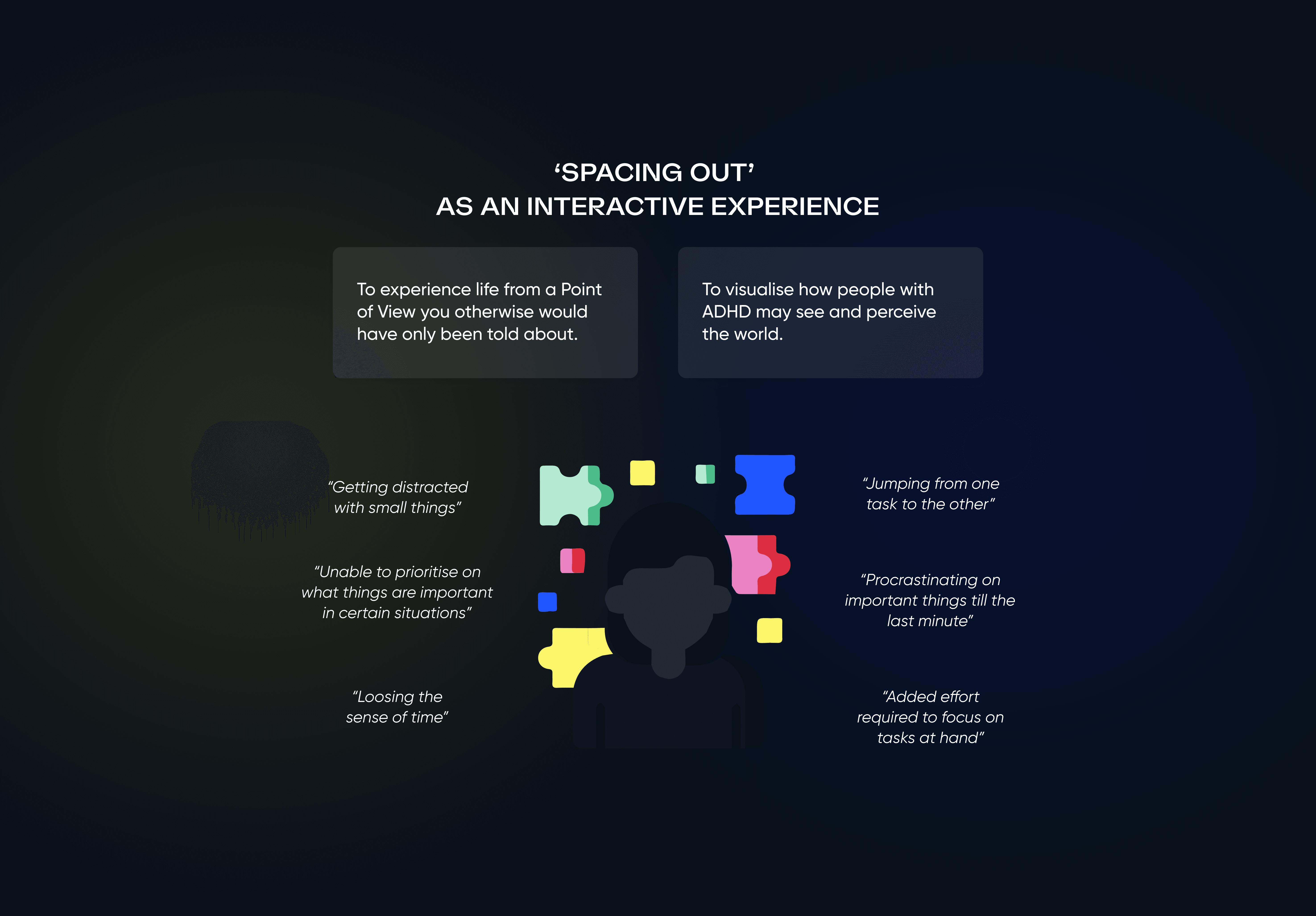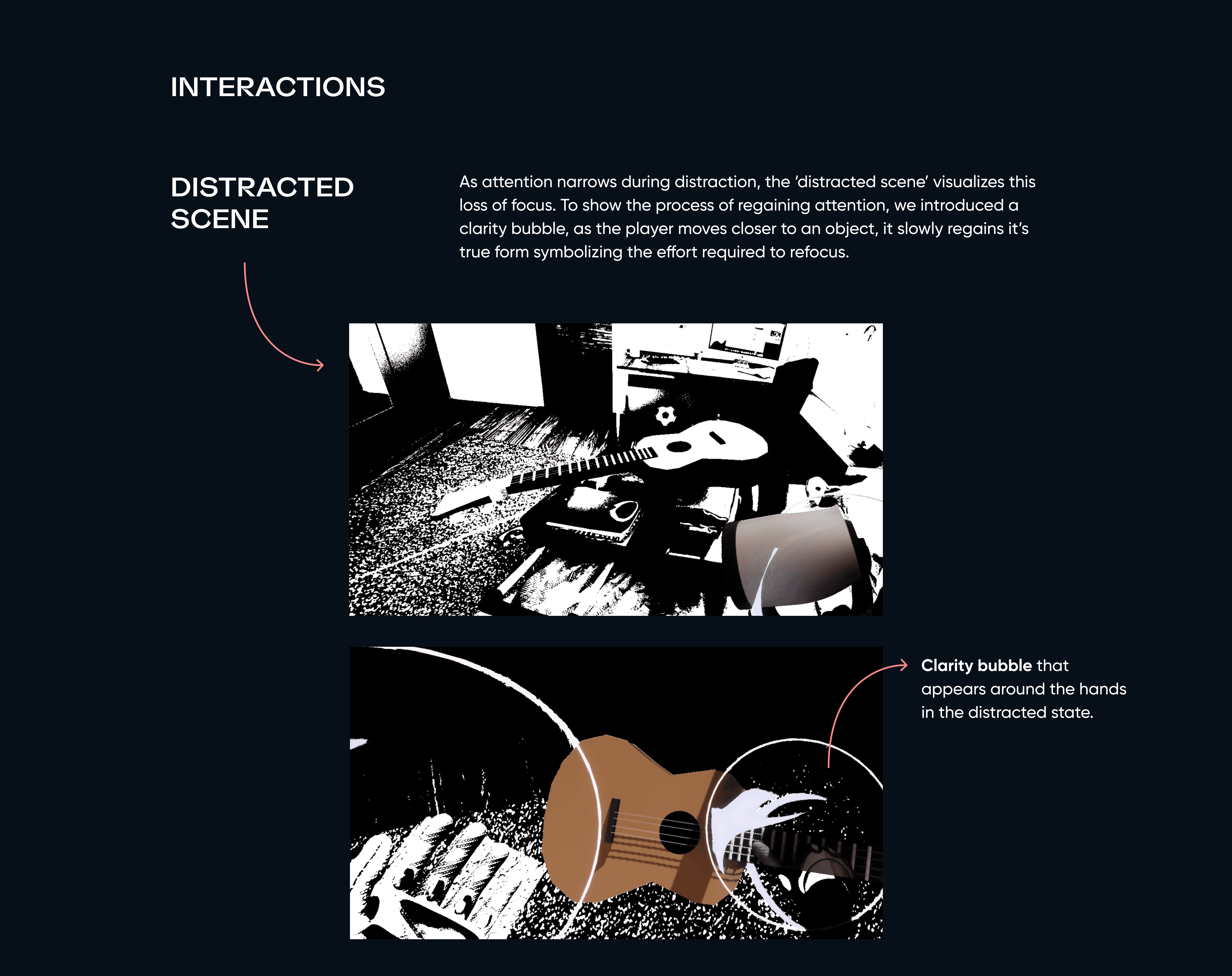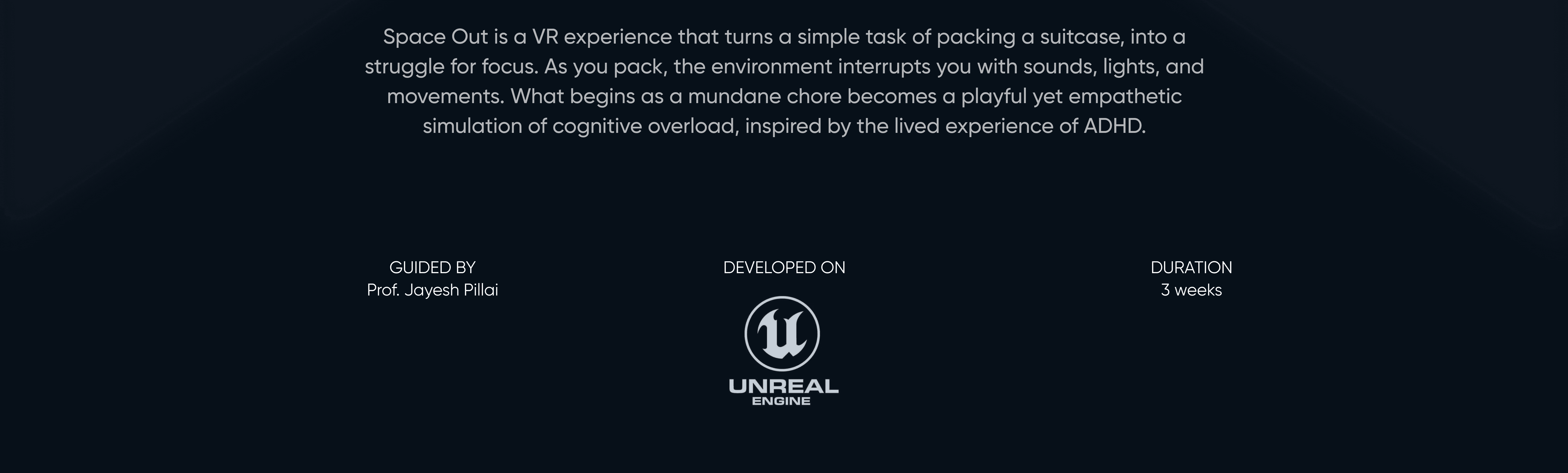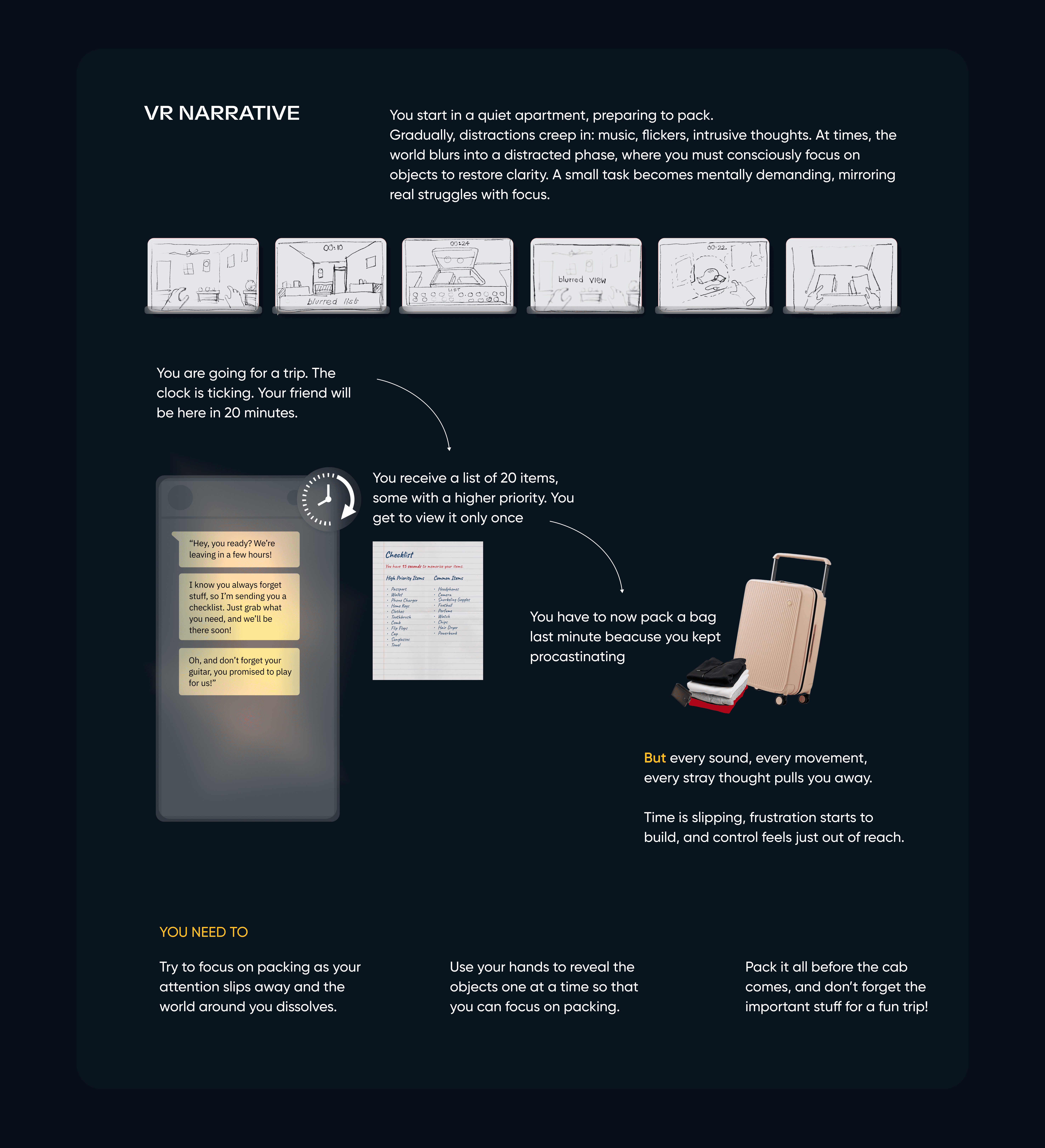 This project creates an immersive VR experience that reveals how distractions affect focus by simulating the struggle of packing a suitcase with ADHD-like cognitive challenges. Through user-driven exploration, shifting sensory cues, and layered environmental storytelling, the design surfaces barriers to sustained attention and task completion. Playtesting and feedback demonstrated that placing users in a realistically distracting setting builds empathy and deepens understanding of neurodivergent experiences, validating the value of playful simulation for perspective-taking and awareness-building.