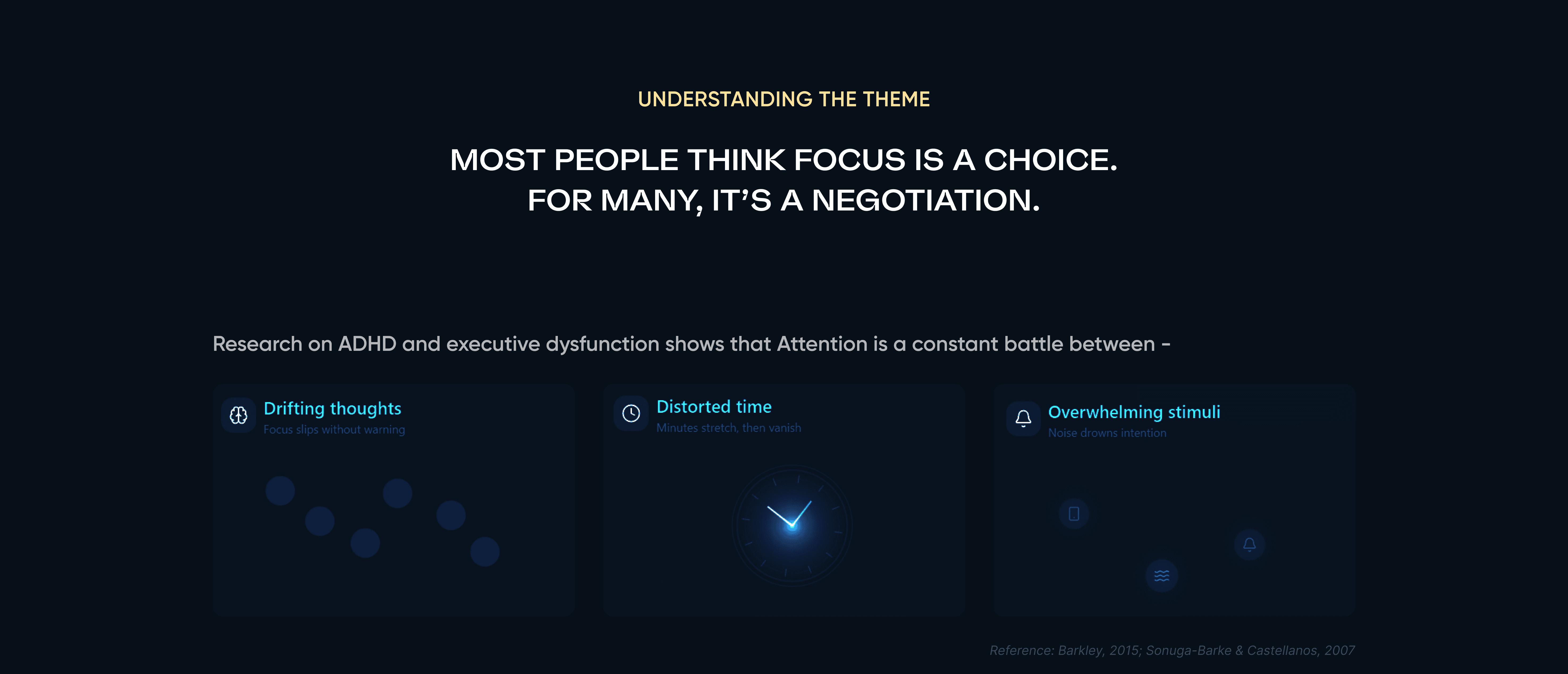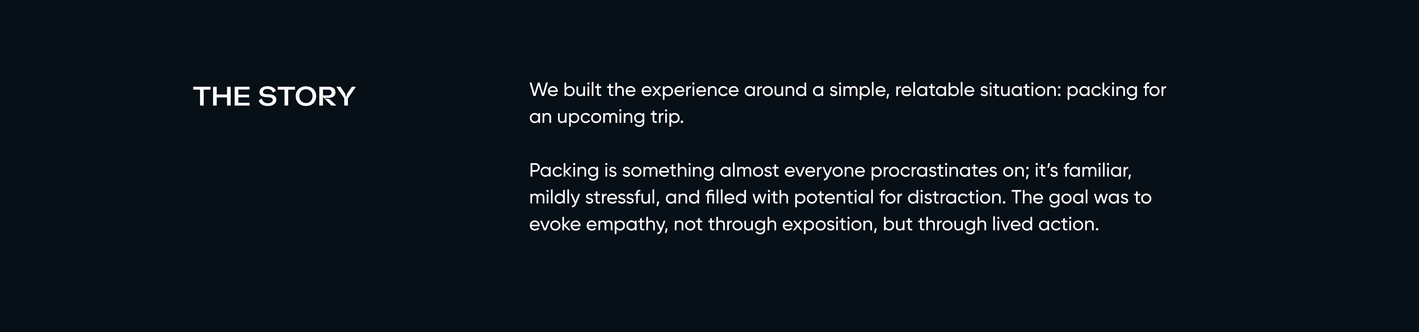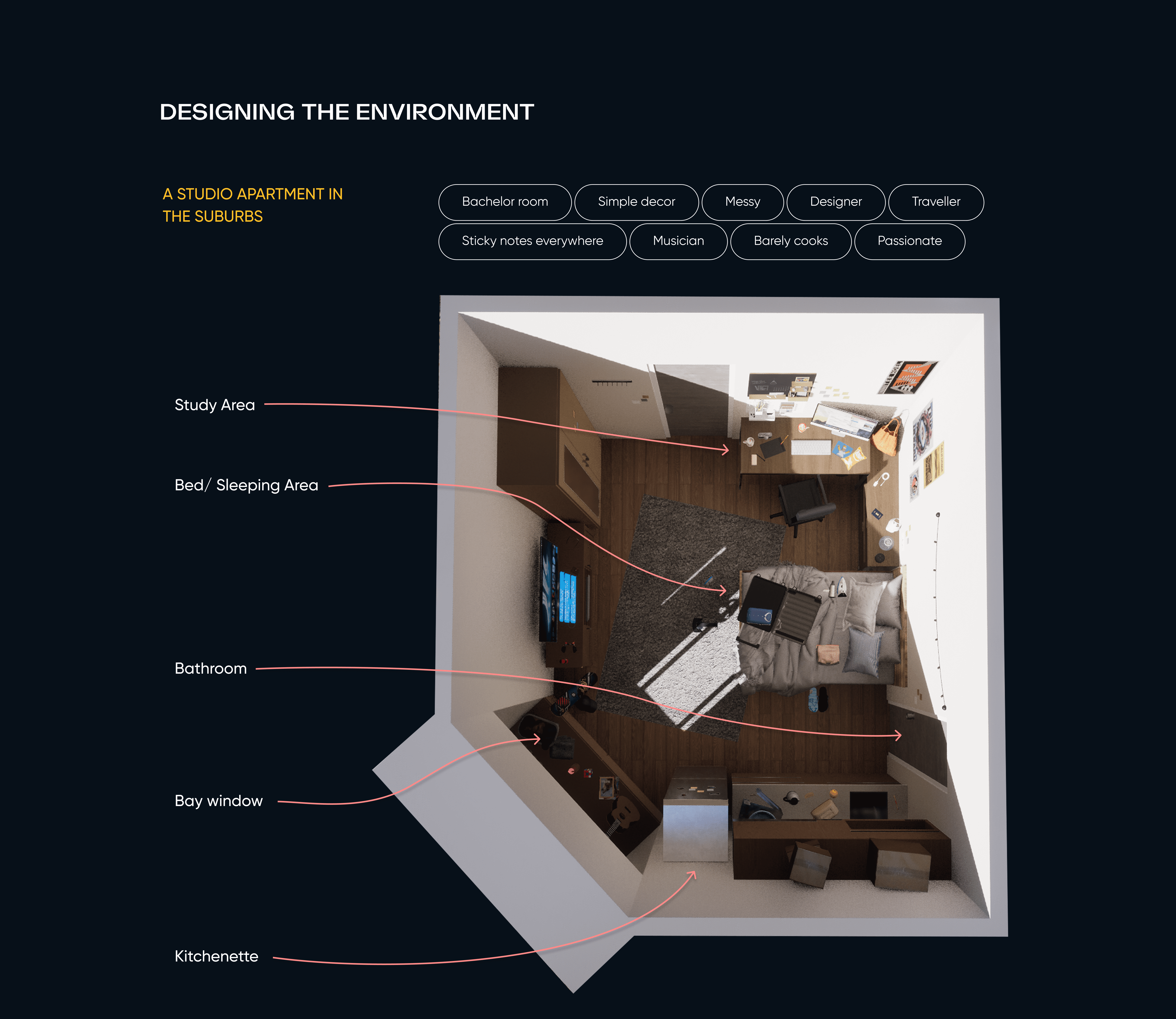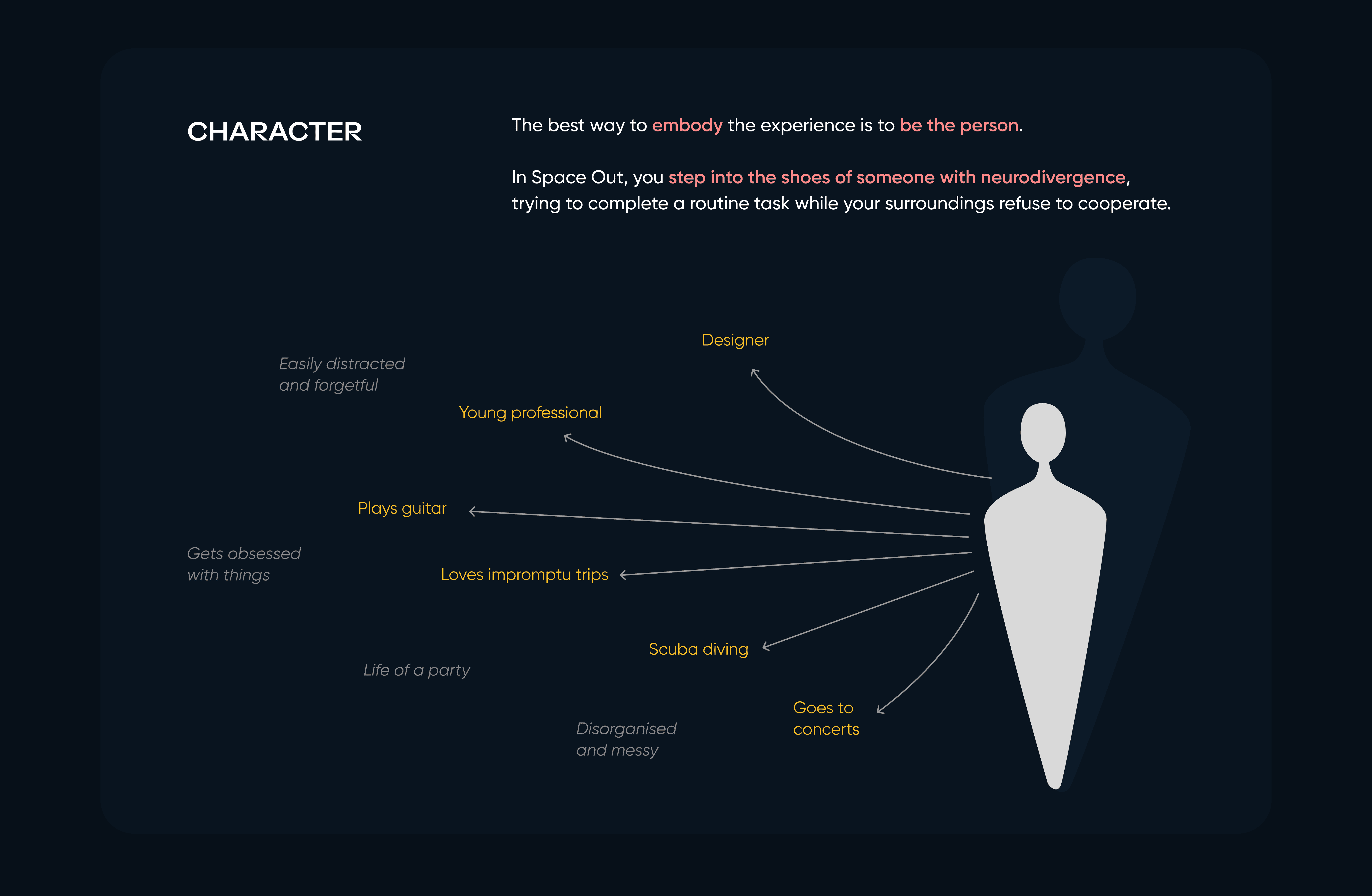 This project creates an immersive VR experience that reveals how distractions affect focus by simulating the struggle of packing a suitcase with ADHD-like cognitive challenges. Through user-driven exploration, shifting sensory cues, and layered environmental storytelling, the design surfaces barriers to sustained attention and task completion. Playtesting and feedback demonstrated that placing users in a realistically distracting setting builds empathy and deepens understanding of neurodivergent experiences, validating the value of playful simulation for perspective-taking and awareness-building.